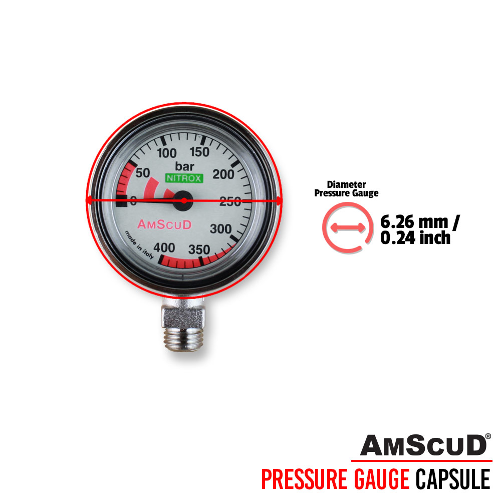 The new AMSCUD Pressure gauge comes standard with dual scale (BAR). Up to 400 bar. Enclosed in a small diameter case, helping to reduce bulk and weight. Easy to read numbers and color scale with glow in the dark background. Available as a single pressure gauge with console and hose or single pressure gauge for replacement. The AMSCUD Pressure Gauge has an all brass case and a 1.75″ (44.5mm) diameter.